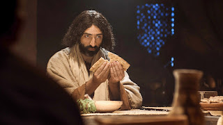逾越節宴席開始,耶穌設立聖餐:先與使徒們共享餐前的一杯酒、再掰餅分給他們 |